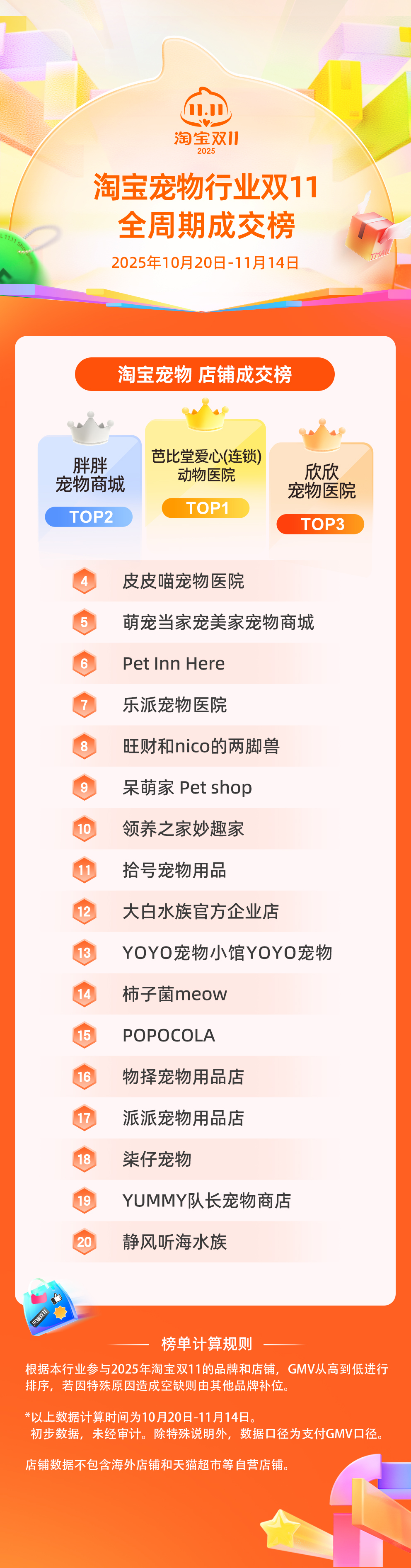 淘宝宠物店铺成交榜TOP10:芭比堂爱心(连锁)动物医院、胖胖宠物商城、欣欣宠物医院、皮皮喵宠物医院、萌宠当家宠美家宠物商城、Pet Inn Here、乐派宠物医院、旺财和nico的两脚兽、呆萌家 Pet shop、领养之家妙趣家