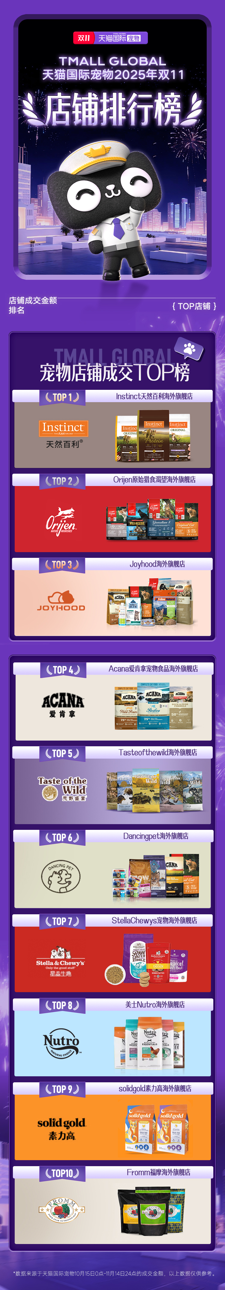 宠物店铺成交榜TOP10:Instinct天然百利海外旗舰店、Oriien原始猎食渴望海外旗舰店、Joyhood海外旗舰店、Acana爱肯拿宠物食品海外旗舰店、Tasteofthewild海外旗舰店、Dancingpet海外旗舰店、StellaChewys宠物海外旗舰店、美士Nutro海外旗舰店、solidgold素力高海外旗舰店、Fromm福摩海外旗舰店
