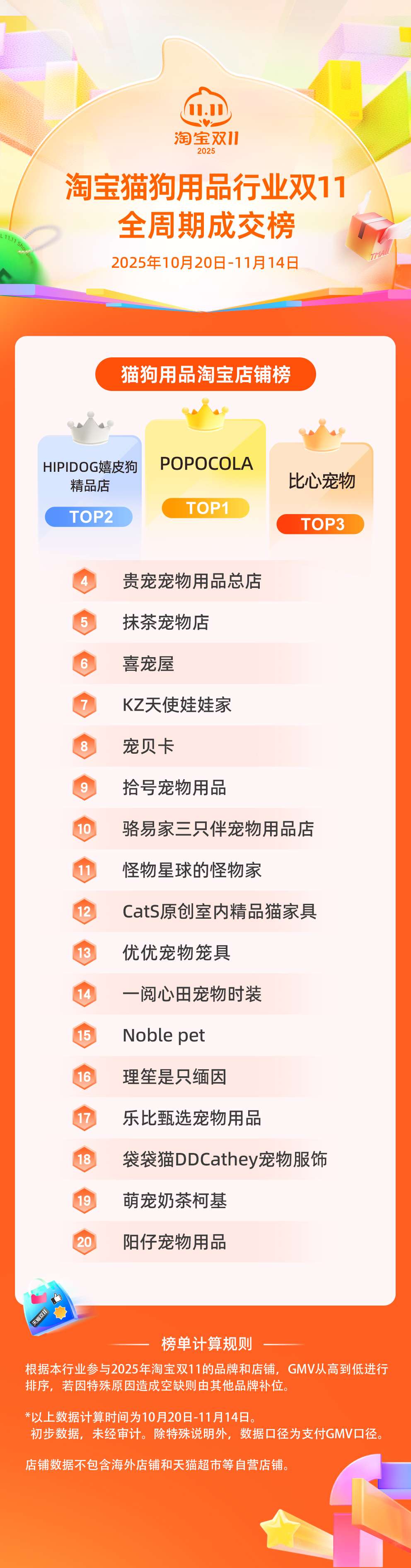 猫狗用品淘宝店铺榜TOP10:POPOCOLA、hipidog嬉皮狗精品店、比心宠物、贵宠宠物用品总店、抹茶宠物店、喜宠屋、KZ天使娃娃家、宠贝卡、拾号宠物用品、骆易家三只伴宠物用品店