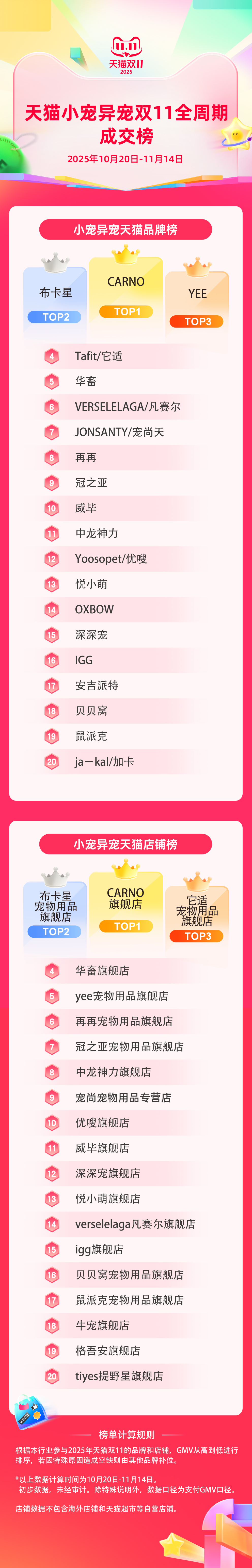 小宠异宠天猫店铺榜TOP10:carno旗舰店、布卡星宠物用品旗舰店、它适宠物用品旗舰店、华畜旗舰店、yee宠物用品旗舰店、再再宠物用品旗舰店、冠之亚宠物用品旗舰店、中龙神力旗舰店、宠尚宠物用品专营店、优嗖旗舰店