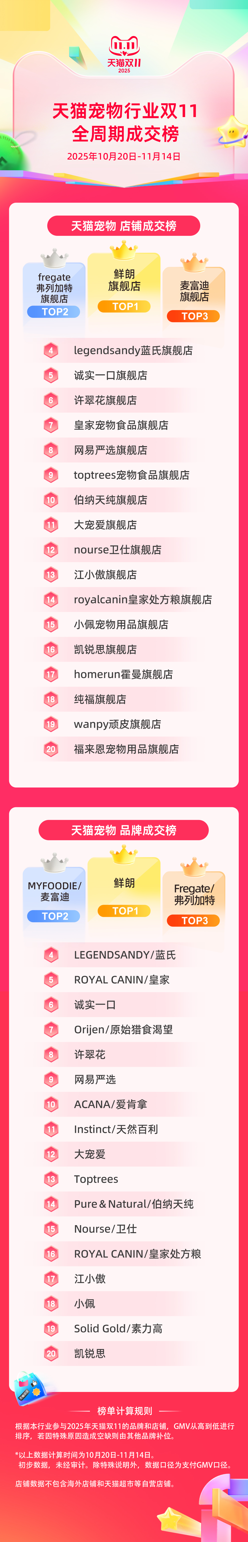 店铺成交榜TOP10:鲜朗旗舰店、fregate弗列加特旗舰店、麦富迪旗舰店、legendsandy蓝氏旗舰店、诚实一口旗舰店、许翠花旗舰店、皇家宠物食品旗舰店、网易严选旗舰店、toptrees宠物食品旗舰店、伯纳天纯旗舰店