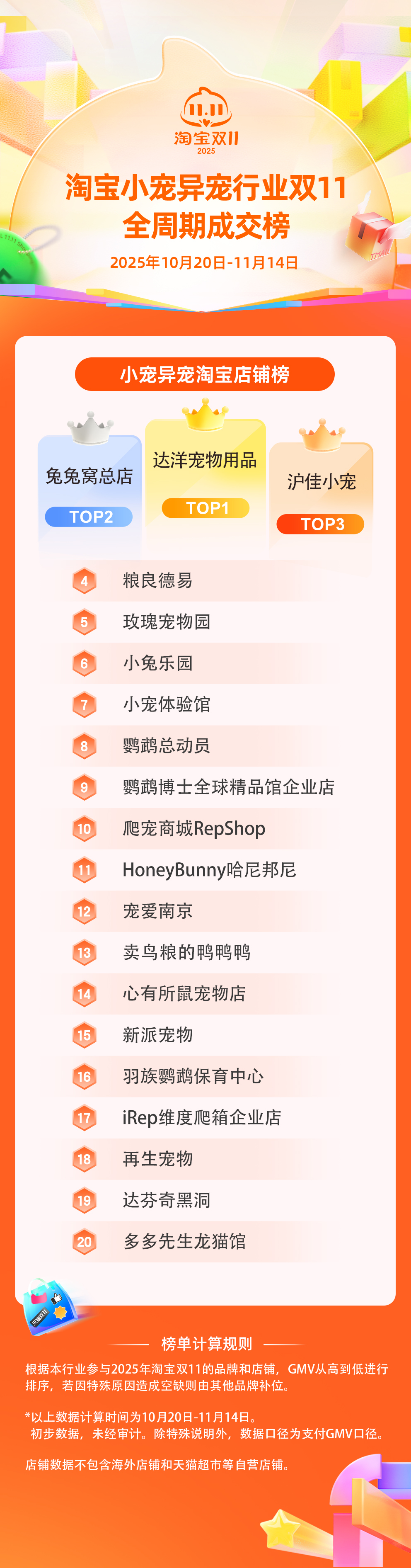 小宠异宠淘宝店铺榜TOP10:达洋宠物用品、兔兔窝总店、沪佳小宠、粮良德易、玫瑰宠物园、小兔乐园、小宠体验馆、鹦鹉总动员、鹦鹉博士全球精品馆企业店、爬宠商城RepShop