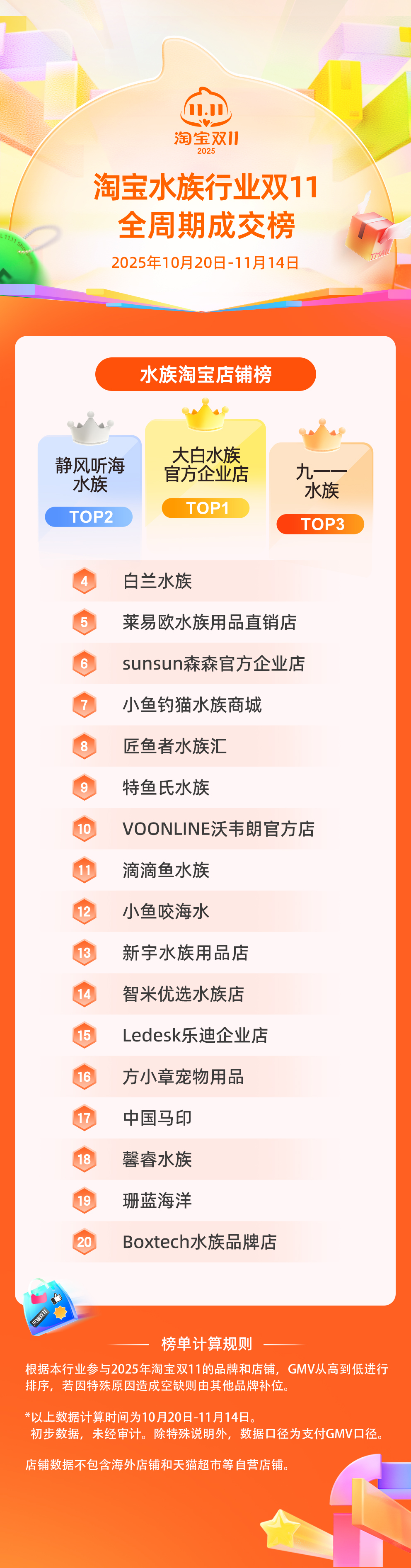 水族淘宝店铺榜TOP10:大白水族官方企业店、静风听海水族、九一一水族、白兰水族、莱易欧水族用品直销店、sunsun森森官方企业店、小鱼钓猫水族商城、匠鱼者水族汇、特鱼氏水族、VOONLINE沃韦朗官方店