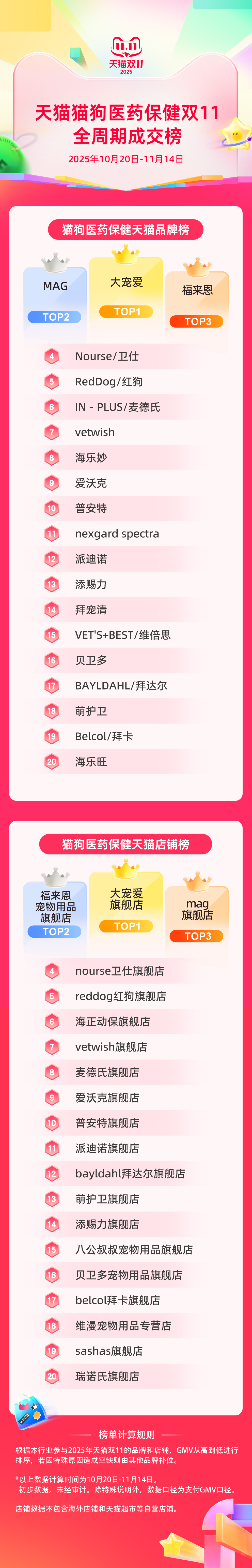 猫狗医药保健天猫品牌榜TOP10:大宠爱、MAG、福来恩、Nourse卫仕、RedDog红狗、IN-PLUS麦德氏、vetwish、海乐妙、爱沃克、普安特