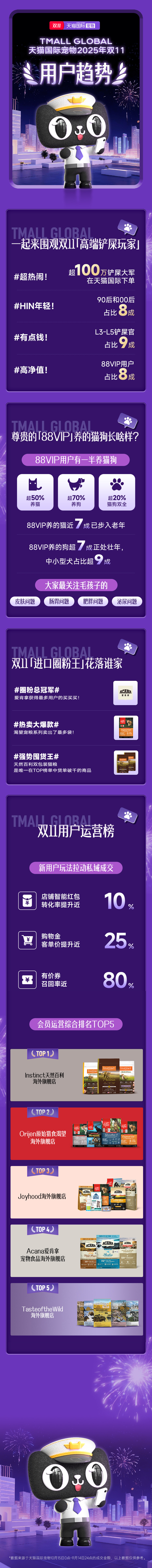 用户趋势:超100万铲屎大军在天猫国际下单,90后和00后占比8成,L3-L5铲屎官占比9成,88VIP用户占比8成,88VIP用户有一半养猫狗,88VIP养的猫近7成已步入老年,88VIP养的狗近7成正处壮年,中小型犬占比超9成。
