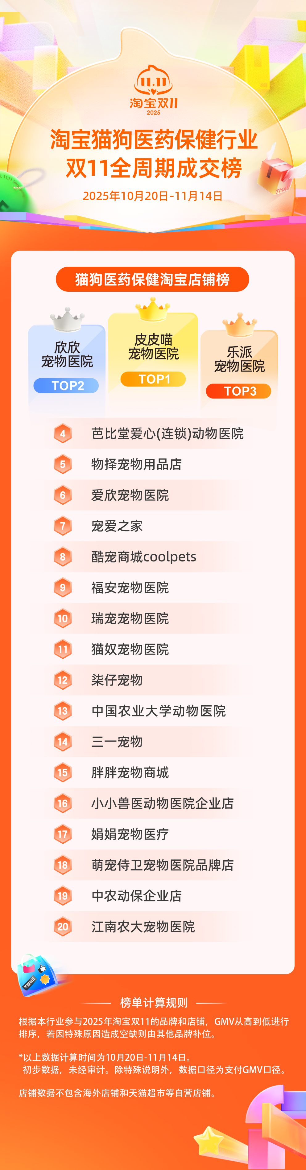 猫狗医药保健淘宝店铺榜TOP10:皮皮喵宠物医院、欣欣宠物医院、乐派宠物医院、芭比堂爱心(连锁)动物医院、物择宠物用品店、爱欣宠物医院、宠爱之家、酷宠商城coolpets、福安宠物医院、瑞宠宠物医院