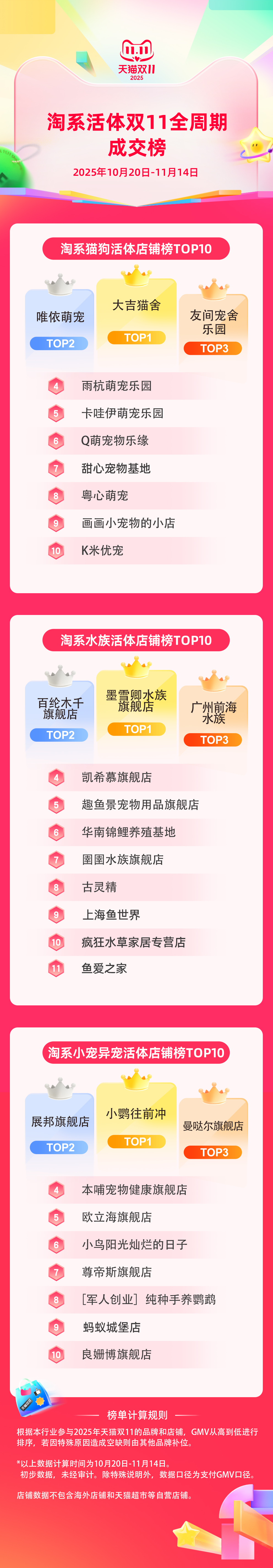淘系猫狗活体店铺榜TOP10:大吉猫舍、唯依萌宠、友间宠舍乐园、雨杭萌宠乐园、卡哇伊萌宠乐园、 Q 萌宠物乐缘、甜心宠物基地、粤心萌宠、画画小宠物的小店、K 米优宠