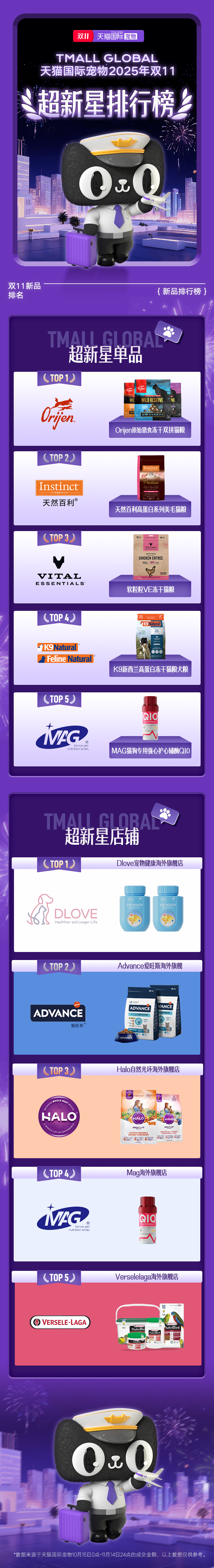 超新星店铺榜TOP5:Dlove宠物健康海外旗舰店、Advance爱旺斯海外旗舰、Halo自然光环海外旗舰店、Mag海外旗舰店、Verselelaga海外旗舰店