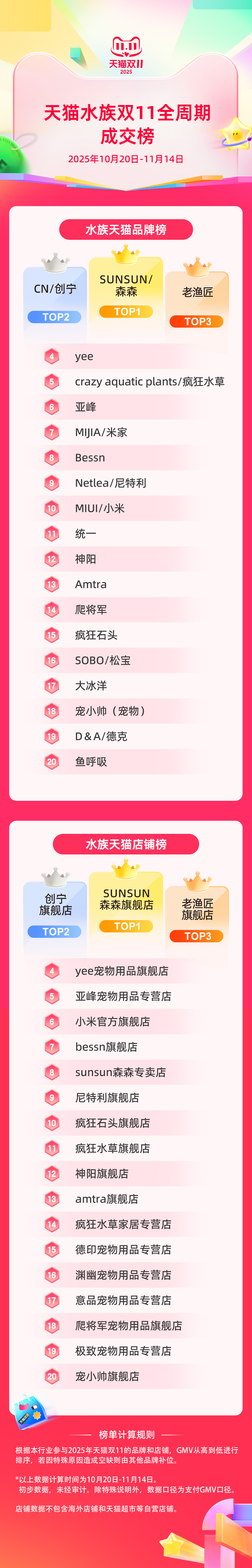 水族天猫品牌榜TOP10:SUNSUN森森、CN创宁、老渔匠、yee、crazy aquatic plants疯狂水草、亚峰、MIJIA米家、Bessn、Netlea尼特利、MIUI小米